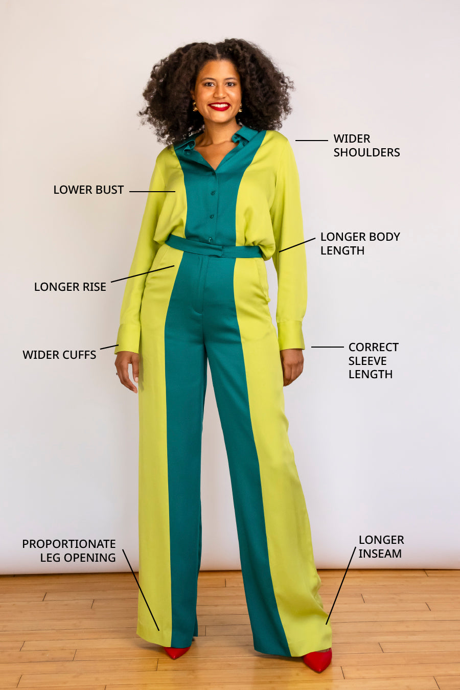 You'll find that our clothes fit better everywhere because the bust, waist, and hips are all lower from your shoulders. This means that the curves will fit better at your curves, highlighting your figure. And for those longer limbs? The elbows and knees are better positioned to make movement more comfortable.