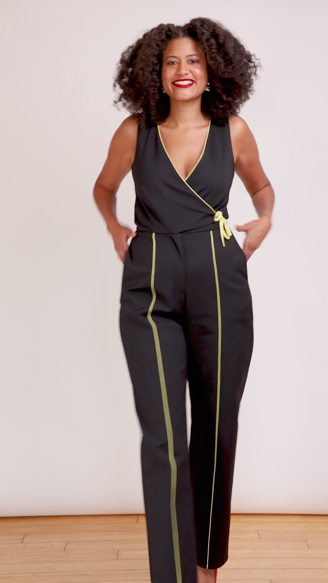 Make an impression in the sensational UK Jumpsuit. Crafted exclusively for tall women, the sleek black jumpsuit is accentuated with vibrant chartreuse piping to highlight to your statuesque long lines and curves. With an easily adjustable wrap front and zipper fly, the wrinkle resistant stretch cotton-nylon jumpsuit moves with you to ensure you feel confident from the boardroom to a night out with friends. Exude timeless sophistication every time you wear the UK Jumpsuit.
